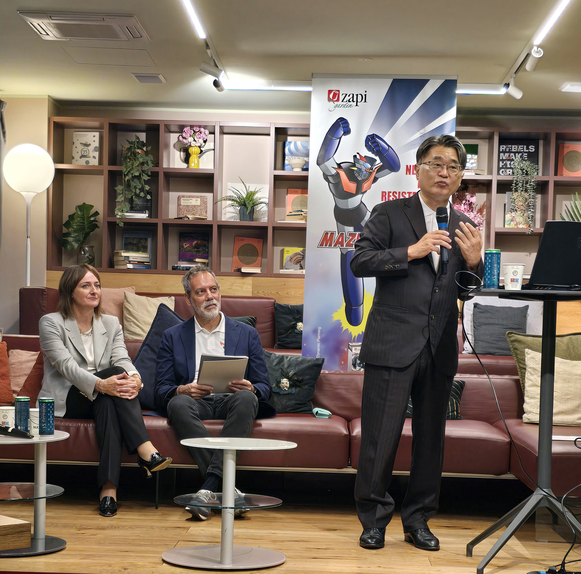 L’idea, ha spiegato Muramoto, è nata in una sera del giugno scorso passeggiando per le vie di Tokyo. Muramoto aveva già notato con stupore come in Italia fosse ancora vivo dopo una cinquantina d’anni il ricordo di Mazinga Z* e, ricordando la giovinezza sull’onda della sigla che accompagnava il cartoon, ha pensato di abbinare la cultura giapponese del coraggio, potenza e ingegno rappresentata da Mazinga Z* con i rodenticidi Zapi a maggior contenuto tecnologico perché portatori degli stessi valori di sicurezza, efficacia e innovazione.